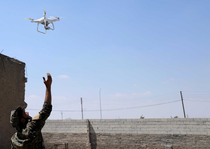 Um combatente das Forças Livres da Síria lança um drone equipado com uma câmara de vídeo, em Raqqa, em junho de 2017 Rodi Said - Reuters