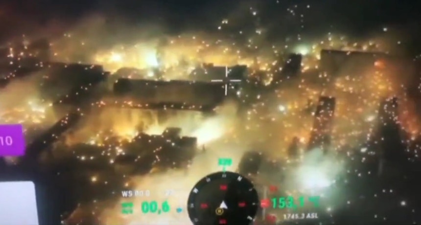 Várias imagens de drone divulgadas pelas forças ucranianas mostram a cidade de Bakhmut em chamas, enquanto caem projéteis incandescentes sobre a cidade.