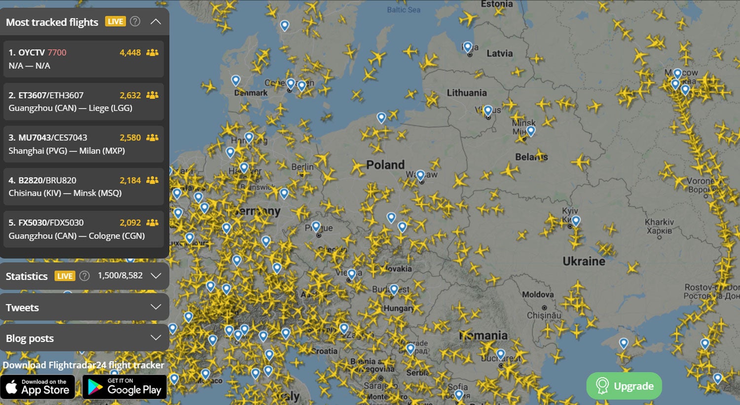 O site de rastreio Flightradar24 mostra pouca atividade nos céus da Bielorrússia, exceto para companhias áreas russas e bielorrussas.