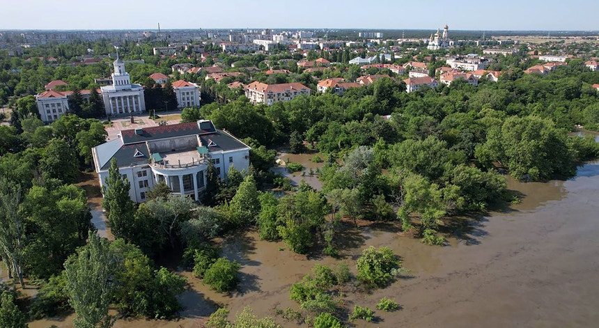 A destruição da barragem de Kakhovka, na manhã de terça-feira, cuja responsabilidade é negada por Moscovo e Kiev, matou pelo menos cinco pessoas e obrigou milhares a abandonar cidades e aldeias inundadas em ambas as margens do rio, incluindo partes da capital regional, Kherson.