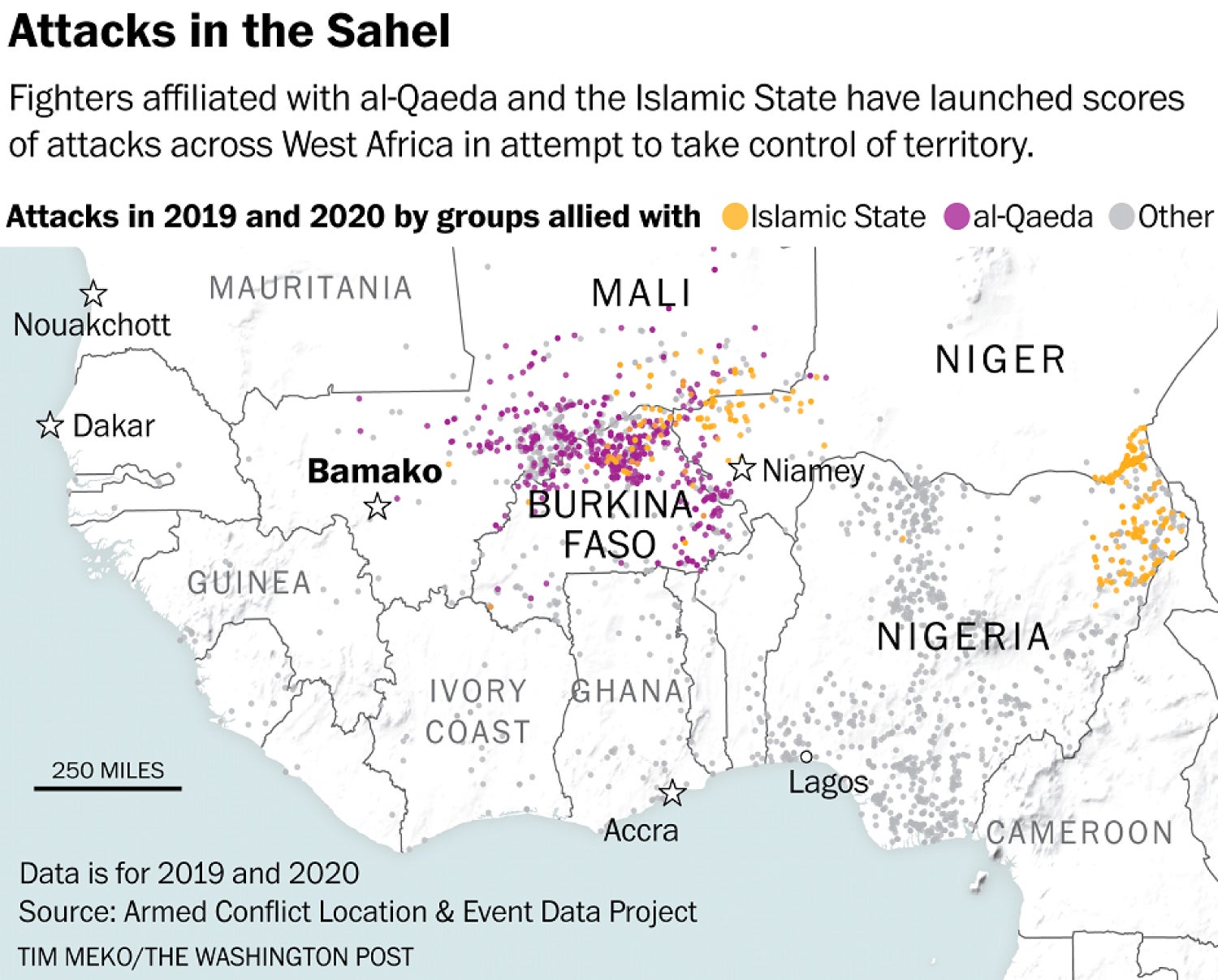 A retirada das forças norte-americanas e a inoperância da UE pioraram as condições de segurança. Somente grandes eventos – como o colapso de governos ou a tomada formal de território por parte destes grupos militantes (como a al-Qaeda fez no Mali em 2011) – poderão levar a que o Ocidente empregue mais tropas e recursos para combater esta ameaça no Sahel. Até lá, com o apoio internacional reduzido, a fragilidade dos Estados e a permanente rivalidade entre vários grupos jihadistas, são os locais que vão sentir os confrontos crescentes e a competição por recursos, dinheiro e recrutamento.