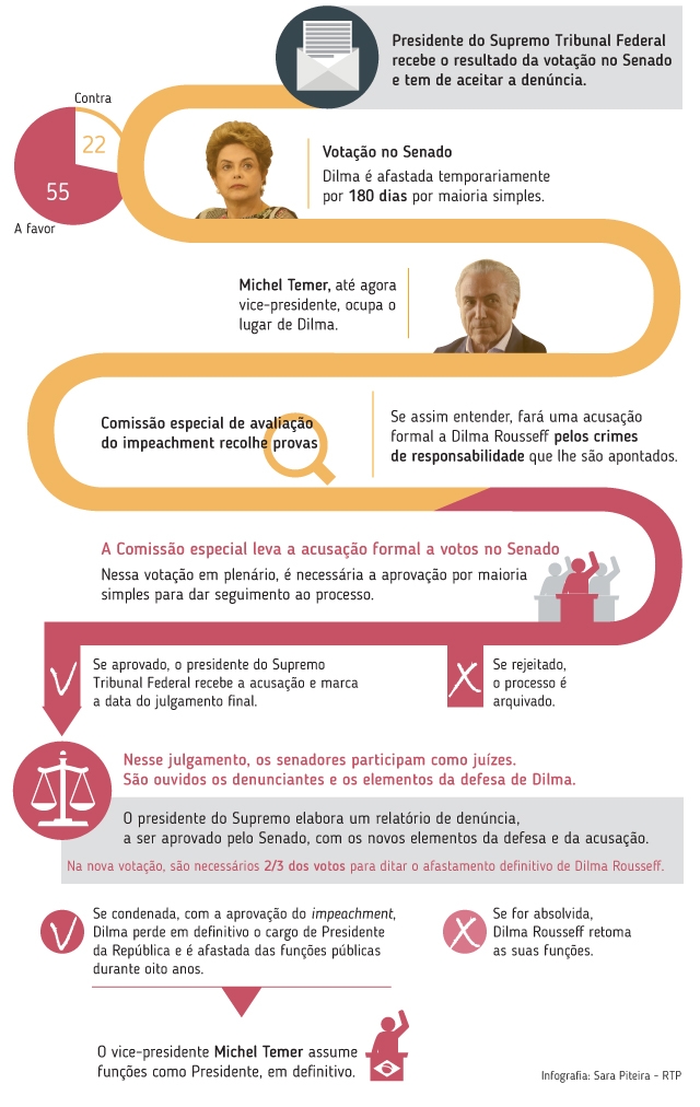 A votação dos senadores ditou esta quarta-feira o afastamento temporário da Presidente brasileira pelo prazo máximo de 180 dias. Agora é à Câmara alta do Parlamento brasileiro que compete avaliar novamente os crimes de responsabilidade de que Dilma é acusada. Um processo que pode ditar o impeachment definitivo e o fim do mandato da Presidente. Entretanto, Michel Temer assume o controlo do Governo.