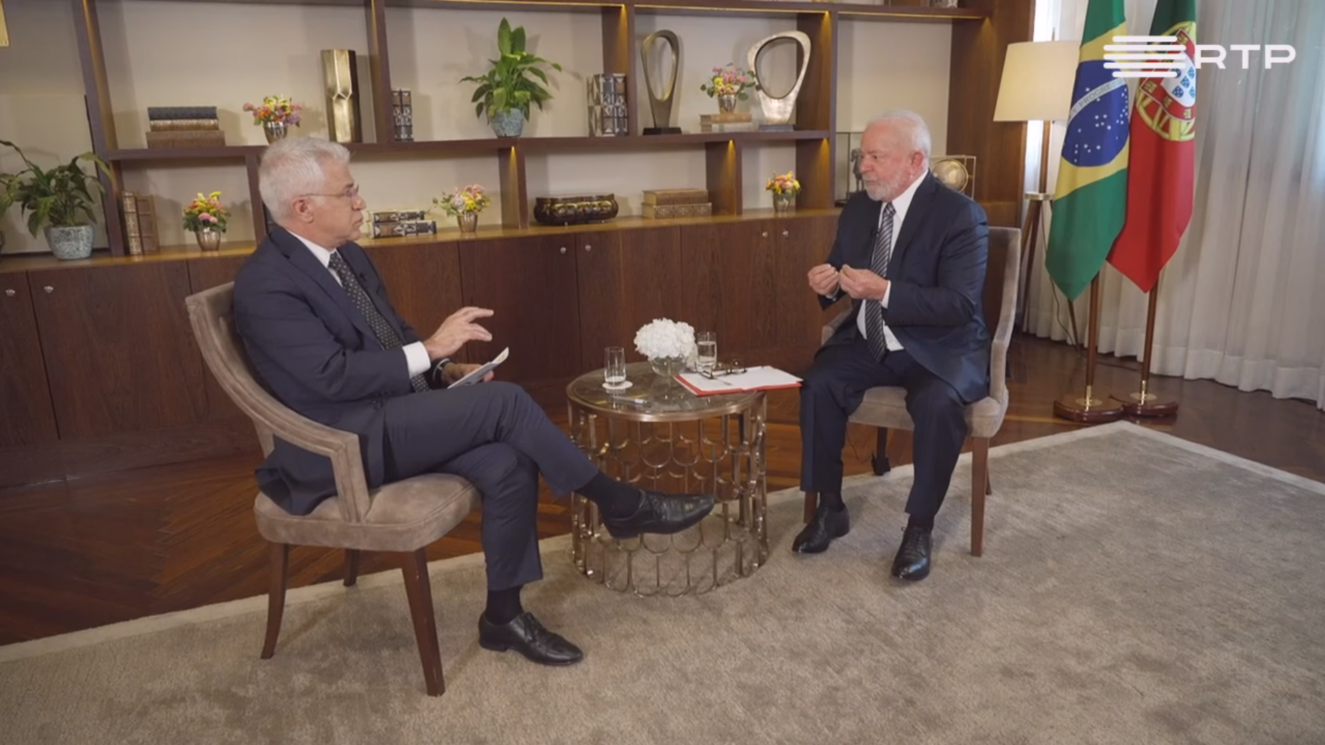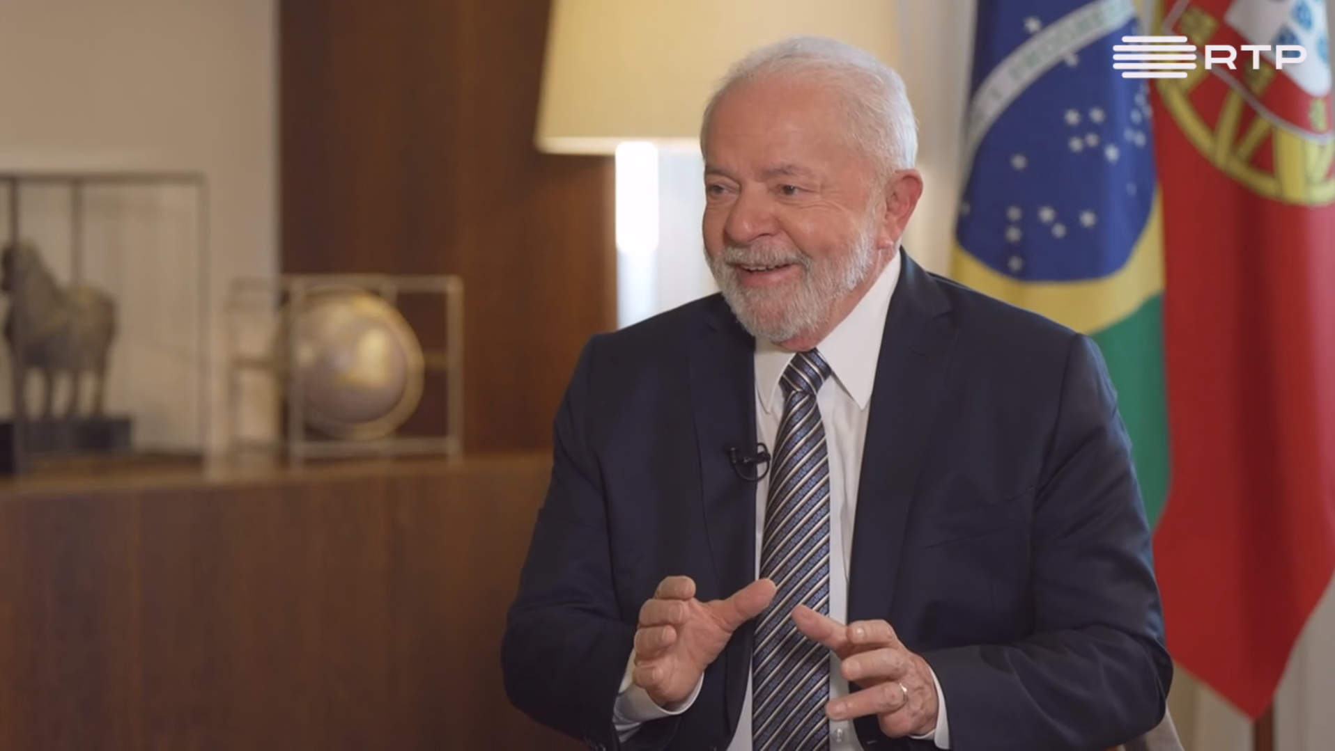 Em entrevista ao jornalista da RTP Paulo Dentinho, o presidente brasileiro procurou desenrolar a ideia que envolve a sua visita oficial a Portugal de que a sua posição sobre a Guerra na Ucrânia se inclina para um apoio à Rússia. Lula da Silva rejeitou que seja esse o seu posicionamento, lançando antes a ideia de que é fundamental colocar os países a trabalhar num plano de paz que consiga sentar os líderes russos e ucranianos à mesa com negociações patrocinadas por Estados Unidos, NATO e União Europeia. Sobre a situação no Brasil, Lula fala da necessidade de promover uma política de diálogo que combata a polarização e faça o país regressar à sua verdadeira natureza, que o anterior presidente, Jair Bolsonaro, procurou destruir com uma polarização extrema. Sobre a polémica da sua vinda a Portugal, diz que "as pessoas não são obrigadas a gostar do Lula ou do Presidente do Brasil" e que tem de respeitar as posições dos portugueses.