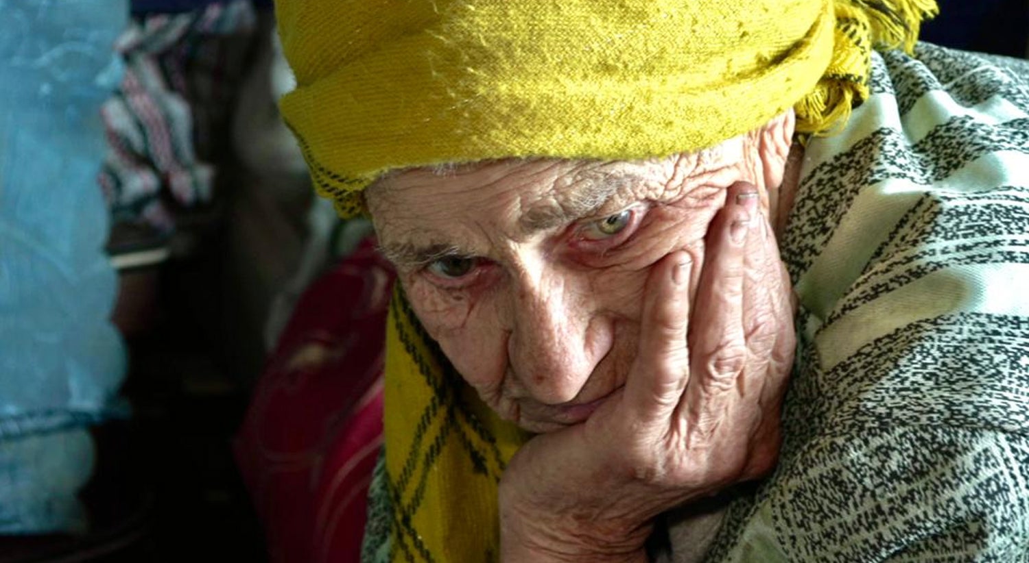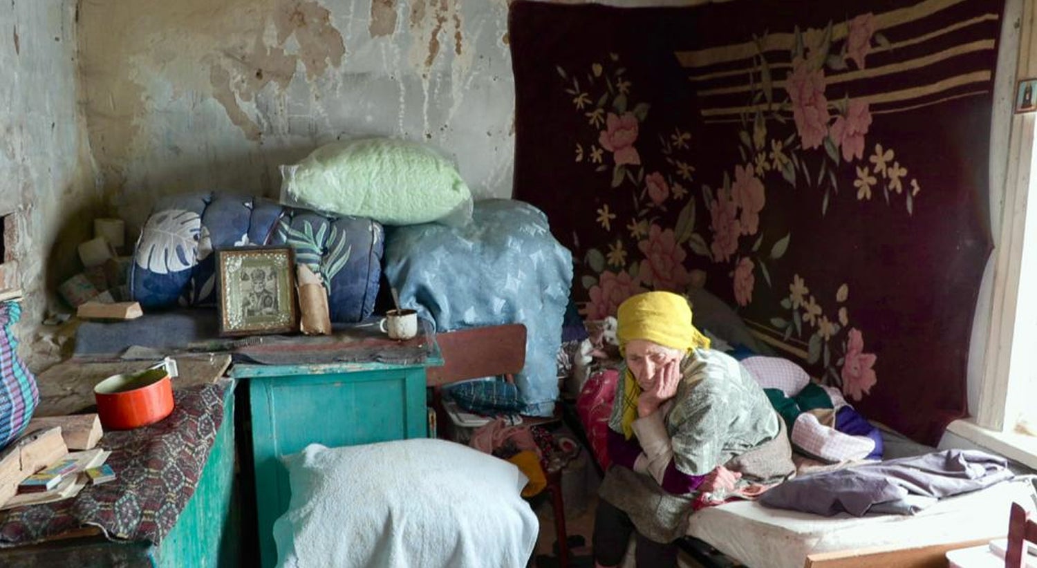 "Mikhola! Fecha a porta!", grita ao filho, encolhida no fundo daquela ruína que já foi casa e de cujo teto esboroado vai pingando o derreter da neve. Mãe, de 93 anos, e seu filho, Mikhola, de 60, foram os únicos habitantes de Bohorodychne que não fugiram da vila, quando esta se tornou linha de combate da agora conhecida como a batalha do Donbass.