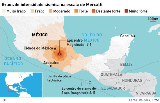 É um segundo sismo de grandes proporções em apenas duas semanas, agora com consequências ainda mais devastadoras. Ao início da tarde de terça-feira (19h14 em Lisboa), o México voltou a tremer: um sismo de magnitude 7,1 na escala de Richter, com epicentro junto a Atencigo, no Estado de Pueblo, e a 57 quilómetros de profundidade.