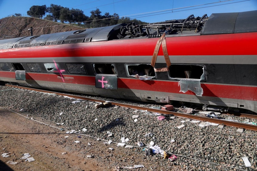 As duas primeiras carruagens do Alvia foram projetadas para fora dos carris depois do choque com os vagões do Iryo descarrilados.