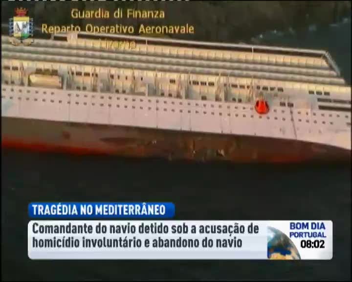 Comandante detidoFrancesco Schettino, o comandante do Costa Concordia, foi ontem detido com as acusações de homicídio múltiplo, naufrágio e abandono de navio. A ordem de prisão foi decretada depois de o comandante ter sido interrogado durante várias horas.