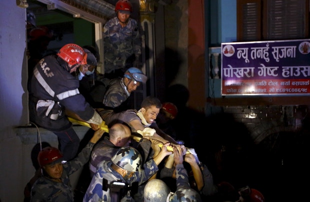 A equipa de resgate francesa demorou algumas horas a conseguir retirá-lo dos escombros. Dez horas, diz um jornal local. Está agora a ser tratado aos ferimentos na perna num hospital na capital nepalesa.