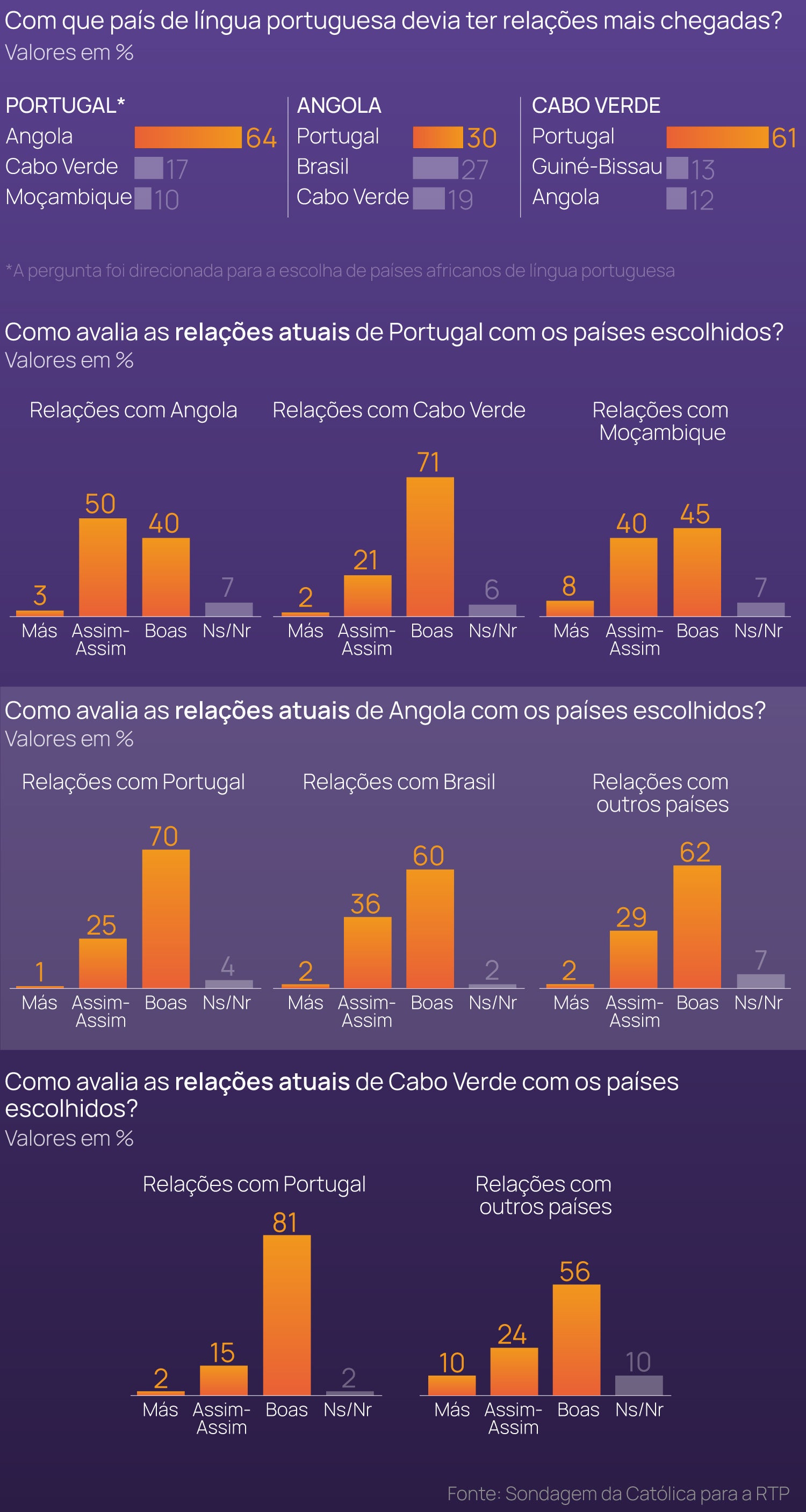 No entanto, na hora de pedir aos inquiridos portugueses com que país africano de língua portuguesa é que Portugal deve ter uma relação mais chegada, a resposta maioritária é Angola (64% colocam o país em primeiro lugar).