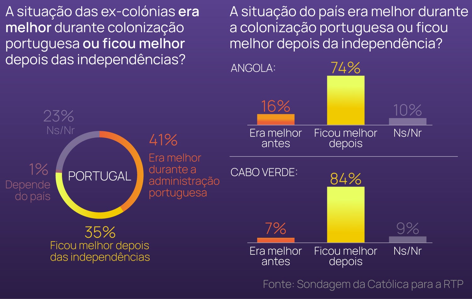 As sondagens da Universidade Católica para a RTP demonstram que os inquiridos em Portugal, Angola e Cabo Verde consideram que o processo de descolonização permitiu a modernização política e económica dos três países. No entanto, angolanos e cabo-verdianos entendem que os seus respetivos países ficaram numa situação melhor após as independências, enquanto os portugueses estão mais divididos e tendem até a considerar que a situação era melhor nestes países durante a administração colonial. Destaque ainda para o reconhecimento e importância atribuídos à Comunidade dos Países de Língua Portuguesa (CPLP) pelos três países.