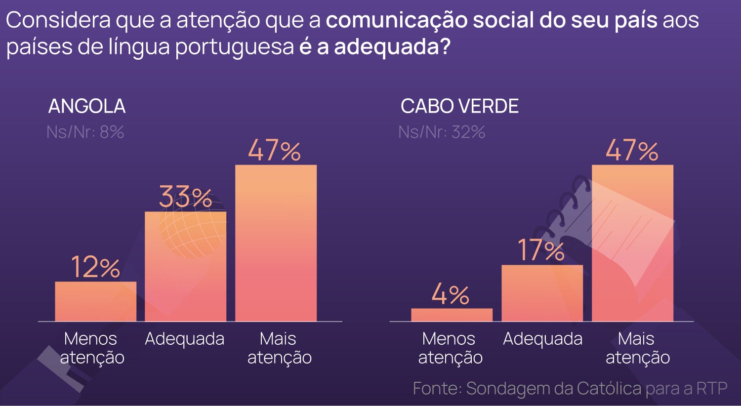 Quando questionados sobre a atenção que os meios de comunicação social angolanos dão aos países de língua portuguesa, há uma percentagem significativa de inquiridos (47%) a querer mais informação, enquanto 33% consideram que a mediatização destes países é a adequada. Outros 12% preferiam que houvesse uma menor cobertura.