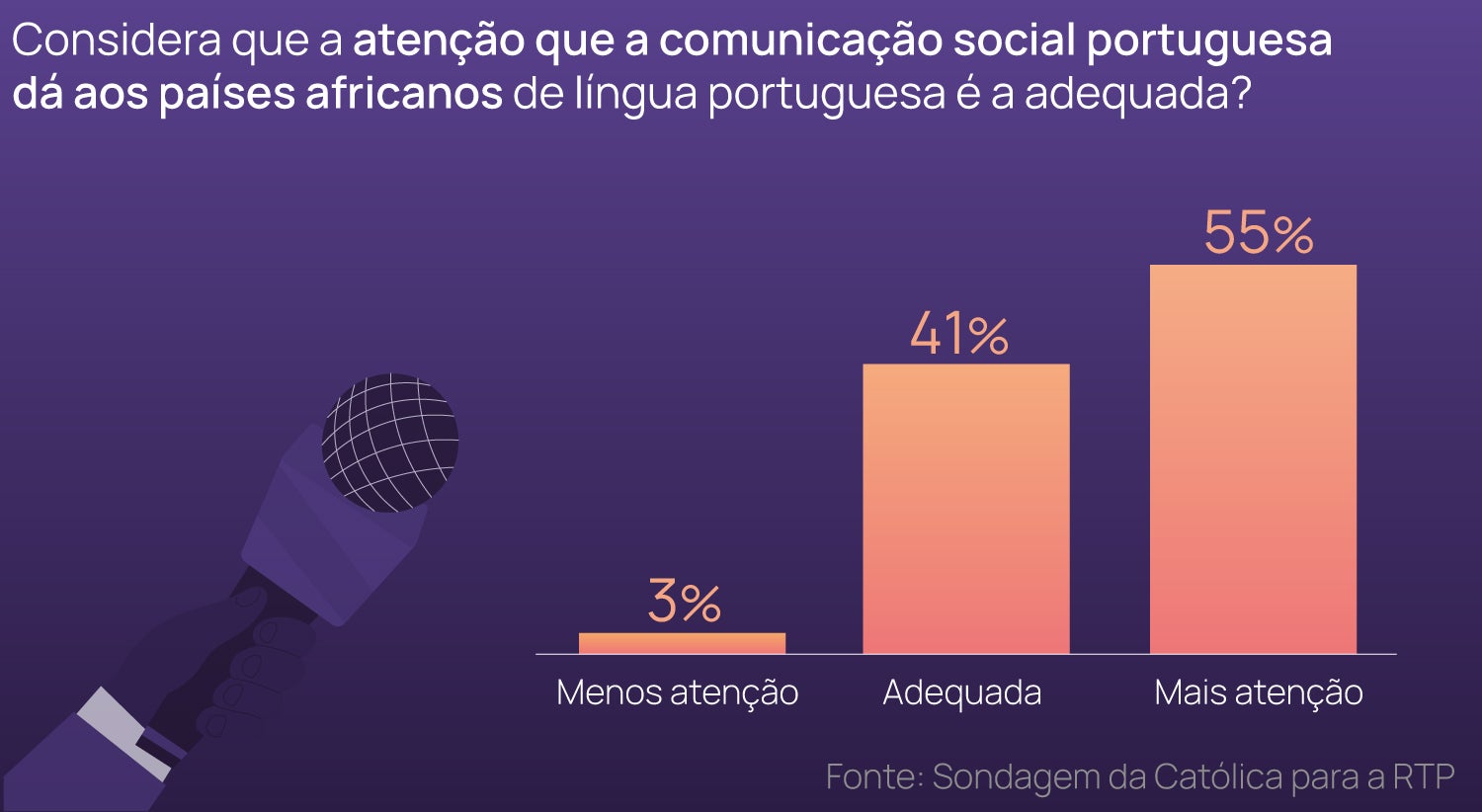 A sondagem da Universidade Católica permite concluir que grande parte da população portuguesa acompanha com interesse as notícias sobre países africanos de língua portuguesa. Um total de 75% dos inquiridos diz seguir informação sobre esses países com “algum interesse” (54%) ou “muito interesse” (21%). Apenas 17% diz ter “pouco interesse” e 5% afirma ter “nenhum interesse”.