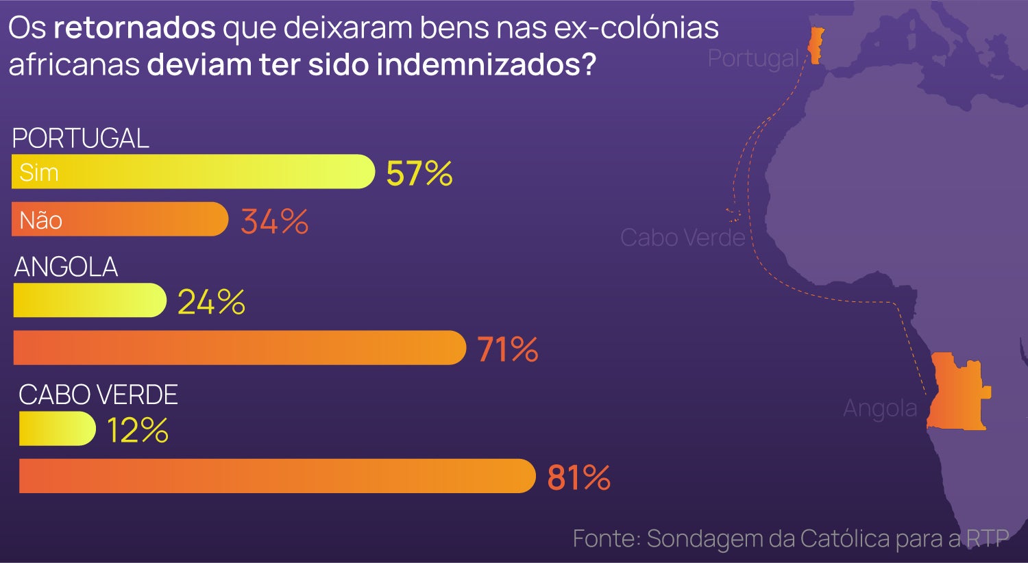 No campo das indemnizações aos portugueses está outra grande diferença entre Portugal e os países africanos de língua portuguesa. Há 57% de inquiridos em Portugal a considerar que os retornados que deixaram bens para trás nas ex-colónias deveriam ter sido indemnizados e 34% que discorda destas compensações.