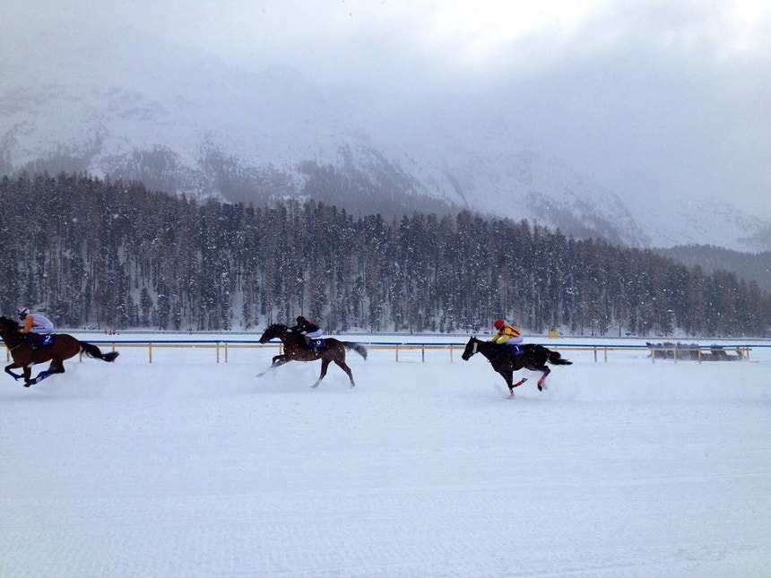 Todos os meses de fevereiro, milhares de pessoas deslocam-se à famosa região montanhosa de luxo de St. Moritz, na Suíça, para assistir à corrida de cavalos no gelo. A corrida, apelidada de White Turf, é o único evento deste género no mundo e é realizada num lago congelado.