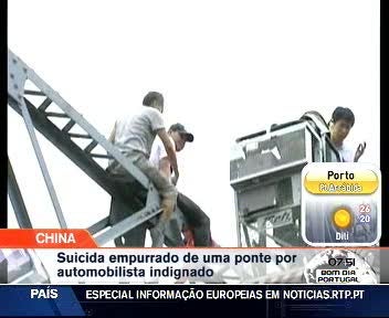 Uma tentativa de suicídio terminou de maneira insólita na China. Um homem trepou ao alto de uma ponte, na província de GuangDong, ameaçando saltar. Ao fim de cinco horas de impasse, um automobilista não aguentou mais o engarrafamento causado pelo incidente. Subiu ele próprio à ponte e deu uma ajuda ao suicida.