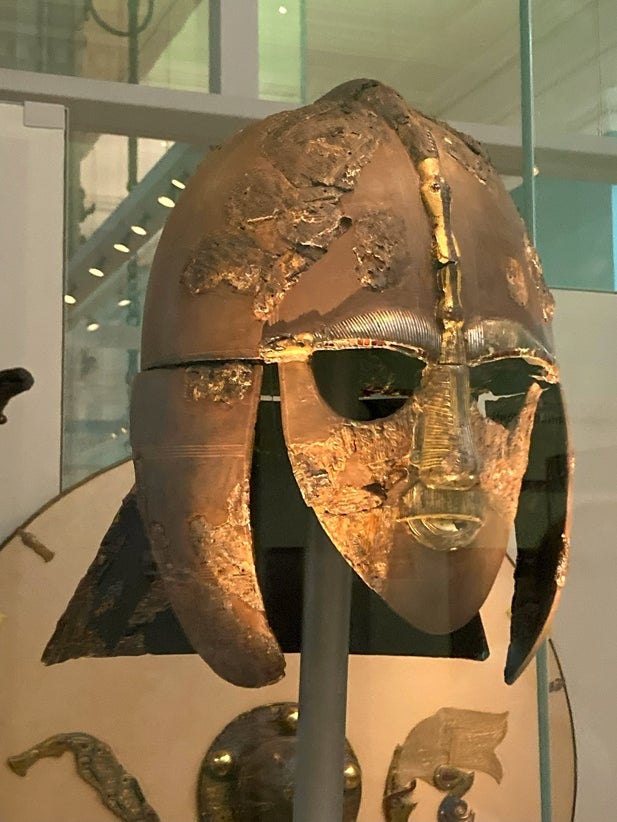 O capacete encontrado no enterramento associado ao rei Raedwald tornou-se o símbolo de Sutton Hoo e da arqueologia da Idade Média, em Inglaterra. Está exposição no Museu Britânico, Londres | Carla Quirino - RTP