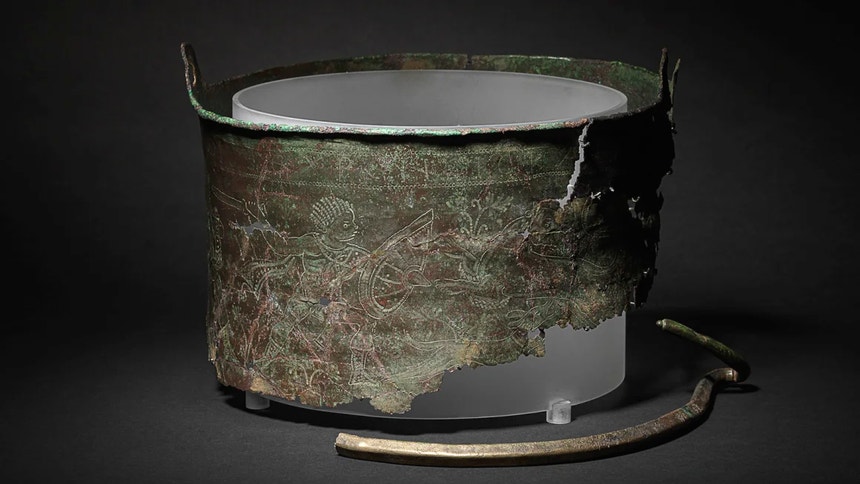 Inicialmente foi encontrada a parede do recipiente produzido numa liga de cobre, na qual estão inscritas decorações como guerreiros, uma variedade de armas, leões e um cão de caça.