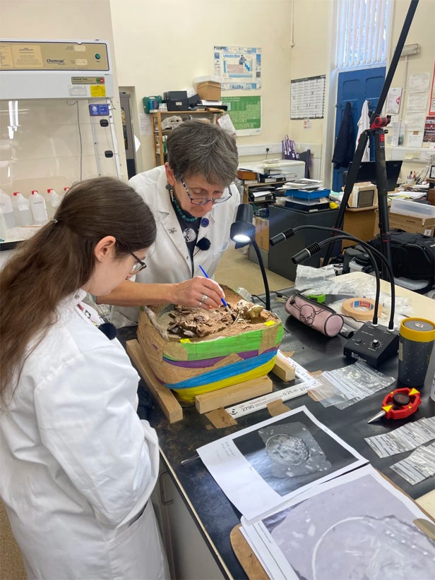 Em laboratório, os investigadores procedem à limpeza da base e conteúdo da peça arqueológica | Património da FAS