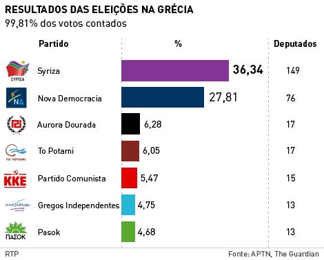 O Syriza fica a dois deputados de conquistar a maioria absoluta no Parlamento grego. Com 36,34 por cento dos votos, a formação de extrema-esquerda conquista 149 assentos parlamentares.Alexis Tsipras tomou posse às 16h00 (14h00 em Lisboa) como primeiro-ministro, perante o Presidente da Grécia, Carolos Papoulias.