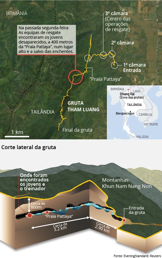 Os jovens encontram-se num lugar alto e a salvo das enchentes, informou Ruengrit Changkwanyuen, um coordenador do contingente tailandês da equipa internacional de mergulho em cavernas, que localizou o grupo na noite de segunda-feira.