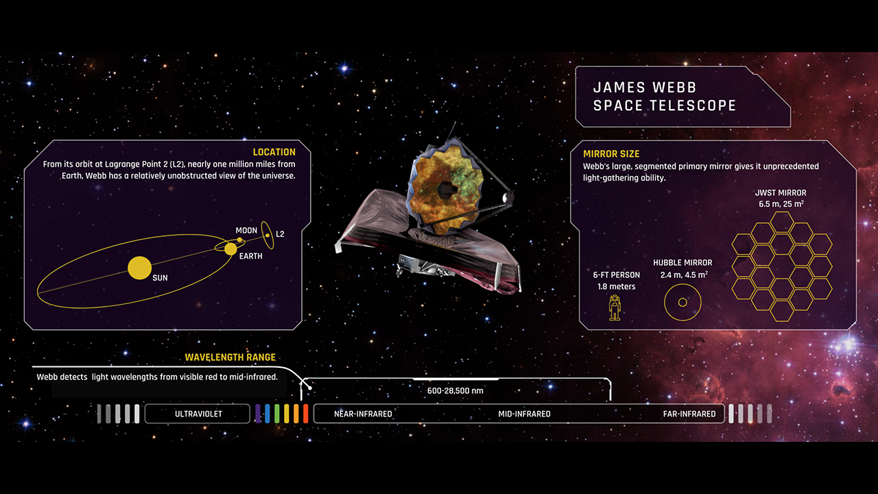 Webb deteta comprimentos de onda de luz no espectro eletromagnético do vermelho visível ao infravermelho médio. Os seus quatro instrumentos fornecem cobertura de comprimento de onda de 600 a 28.500 nanómetros, ou 0,6 a 28,5 mícrons (1 mícron é um milionésimo de um metro). A parte infravermelha do espectro abrange cerca de 0,75 mícrons a algumas centenas de mícrons. Créditos: NASA, Elizabeth Wheatley (STScI)