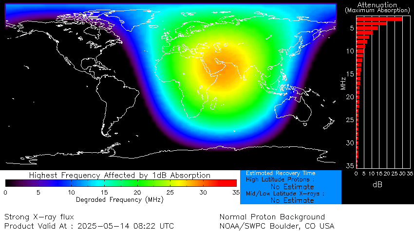 Apagões de rádio observados na Europa, Ásia e mais concentrados no Médio Oriente registados hoje, 14 de maio de 2025. (Crédito da imagem: Centro de Previsão do Clima Espacial da NOAA)