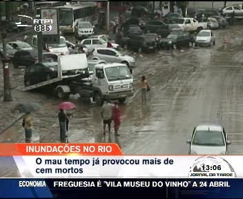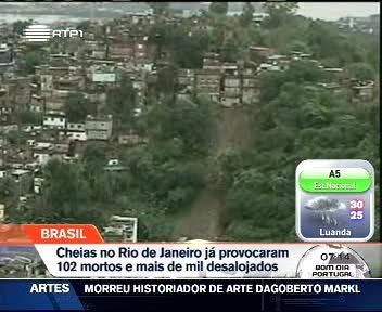 As chuvas fortes que atingem o estado brasileiro do Rio de Janeiro já provocaram 102 mortos, quase dois mil desalojados, meia centena de feridos e quatro desaparecidos. As autoridades afirmam que este é o pior temporal dos últimos 44 anos e o Governador da capital carioca, Sérgio Cabral, já decretou três dias de luto nacional. As previsões meteorológicas apontam para que a continuação de chuva forte.
