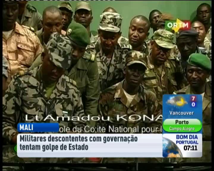 Está em curso um golpe de Estado militar no Mali, soldados estão descontentes com a forma como o governo tem lidado com a rebelião touaregue no norte do país anunciaram a detenção do presidente e a suspensão da constituição. Num comunicado esta manhã na rádio e televisão, os militares prometem devolver o poder aos civis assim que for alcançada a unidade nacional. O secretário-geral da ONU já apelou à calma e à manutenção da ordem constitucional.