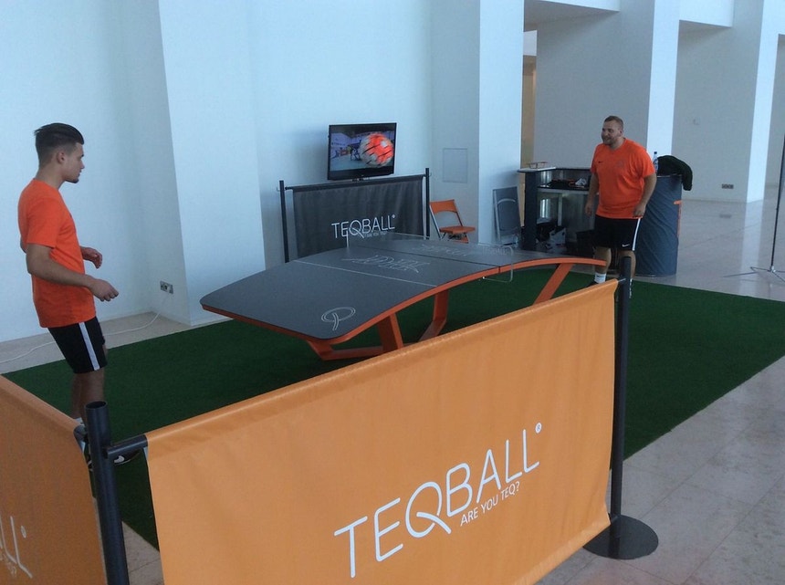 O que é o tecball? É um novo desporto, a meio caminho entre o ténis de mesa e o futebol, e nasceu no Luxemburgo. Podia chamar-se "foot-pong" ou futebol de mesa, mas os seus inventores preferiram baptizá-lo "teqball".