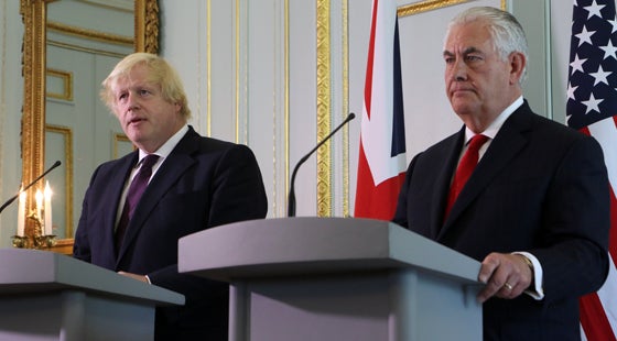 Ao lado do secretário de Estado norte-americano Rex Tillerson, durante uma conferência de imprensa conjunta em Londres, Boris Johnson afirmou que “este não é o momento para fazer algo que subtraia à responsabilidade fundamental daqueles indivíduos, daquele indivíduo em particular que cometeu esta atrocidade”.