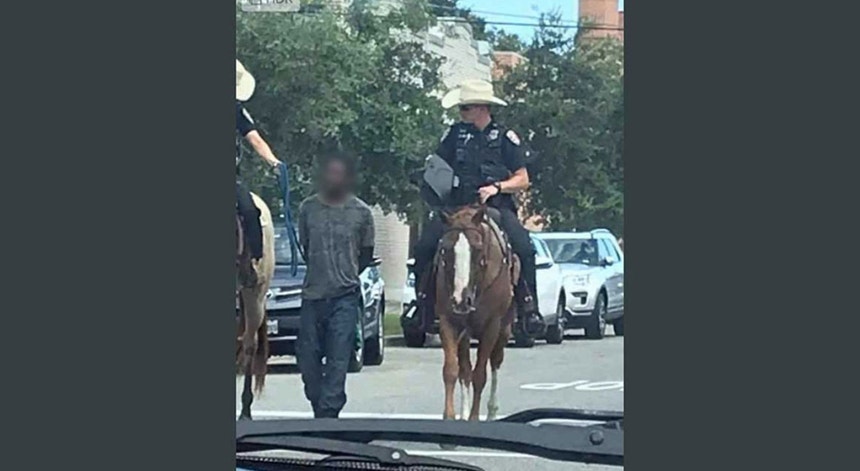 Donald Neely, de 43 anos, foi no sábado detido na cidade de Galveston, no Estado norte-americano do Texas, depois de ser acusado de invasão de propriedade privada. O caso tornou-se viral depois de, na segunda-feira, ter sido divulgada uma fotografia onde os dois agentes surgem a cavalo junto ao homem, com um deles a conduzi-lo pela rua com uma corda atada às algemas.