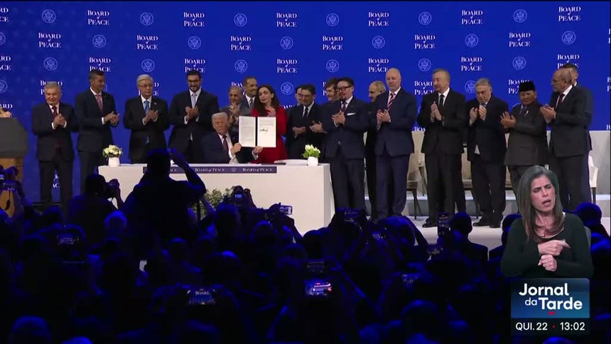 Antes da assinatura da "Carta do Conselho da Paz", ao presidente dos Estados Unidos juntaram-se, no palco do Fórum Económico Mundial, esta quinta-feira, os líderes mundiais dos países que aceitaram integrar o Conselho de Paz para Gaza, presidido pelo próprio Donald Trump.