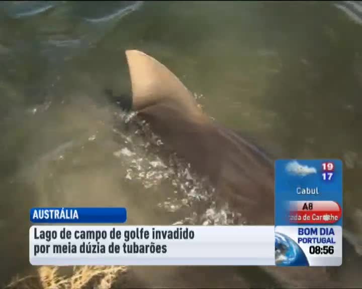 Na Austrália tubarões invadiram o lago de um campo de golfe. Pelo menos seis tubarões foram parar acidentalmente ao lago devido a cheias num rio próximo.