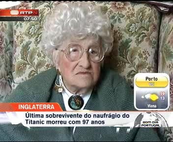Morreu a última sobrevivente do Titanic. Millvina Dean faleceu aos 97 anos, num lar de idosos em Inglaterra. A inglesa tinha apenas nove semanas quando o Titanic naufragou, mas conseguiu resistir às águas geladas do Atlântico norte. A mãe e o irmão de dois anos, que também emigravam para os Estados Unidos, sobreviveram ao naufrágio, mas o pai foi uma das 1500 vítimas do acidente.