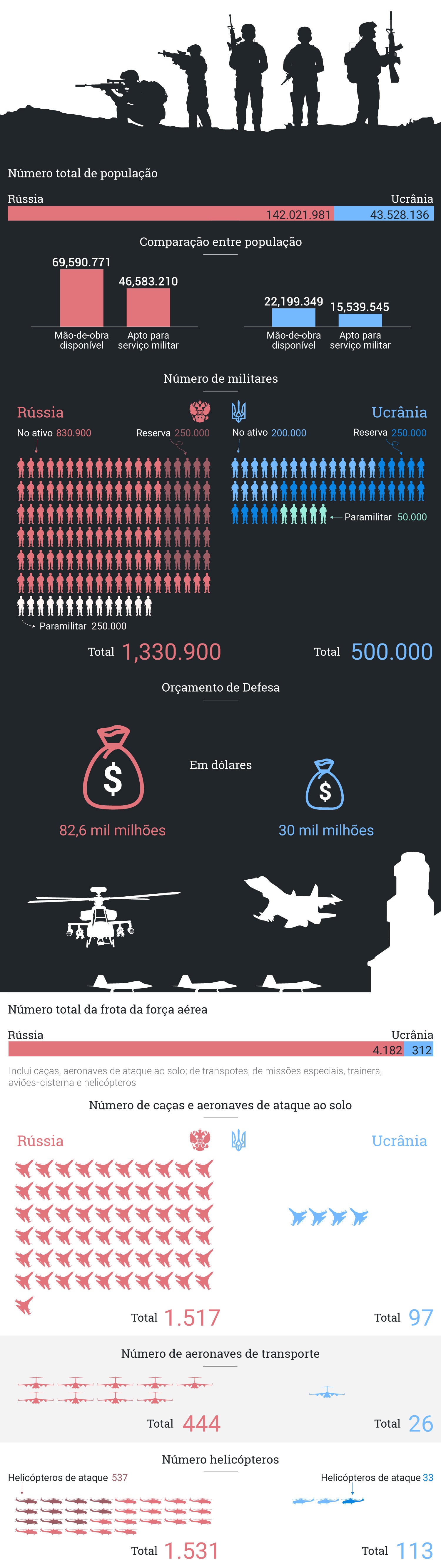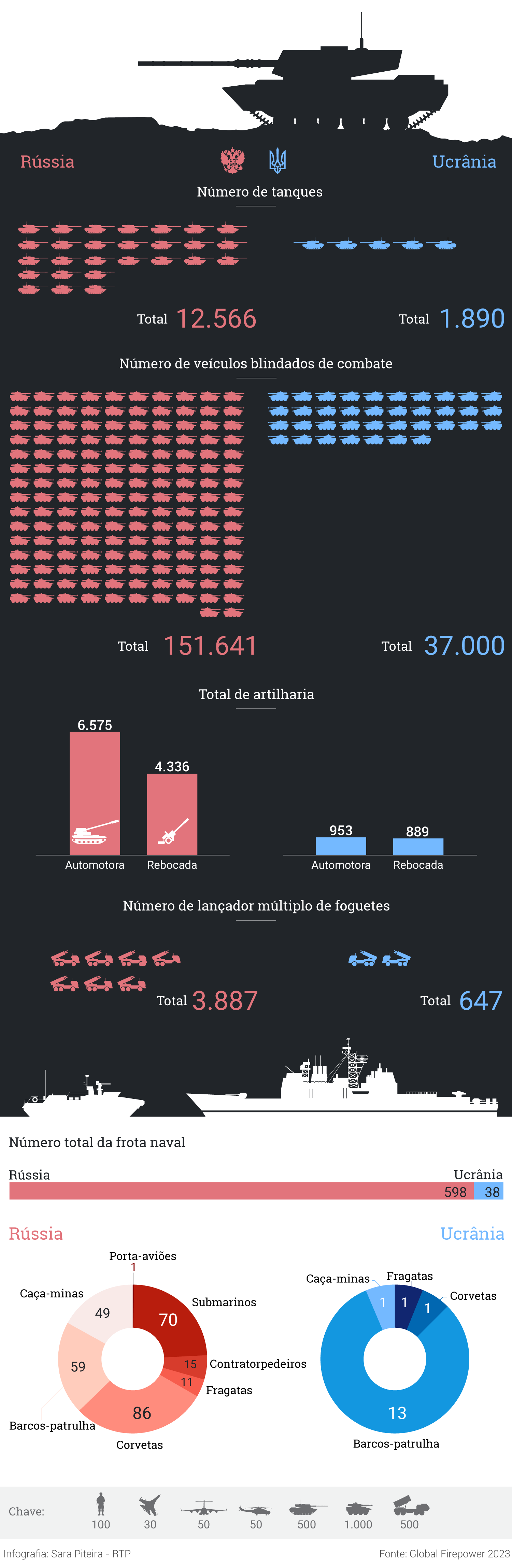 Ao longo dos últimos 12 meses, a entrega do armamento por parte dos países ocidentais tem permitido à Ucrânia responder no terreno. Mas a balança do poder continua naturalmente a favorecer a Rússia, como comprova um quadro comparativo do respetivo potencial militar, já de 2023.