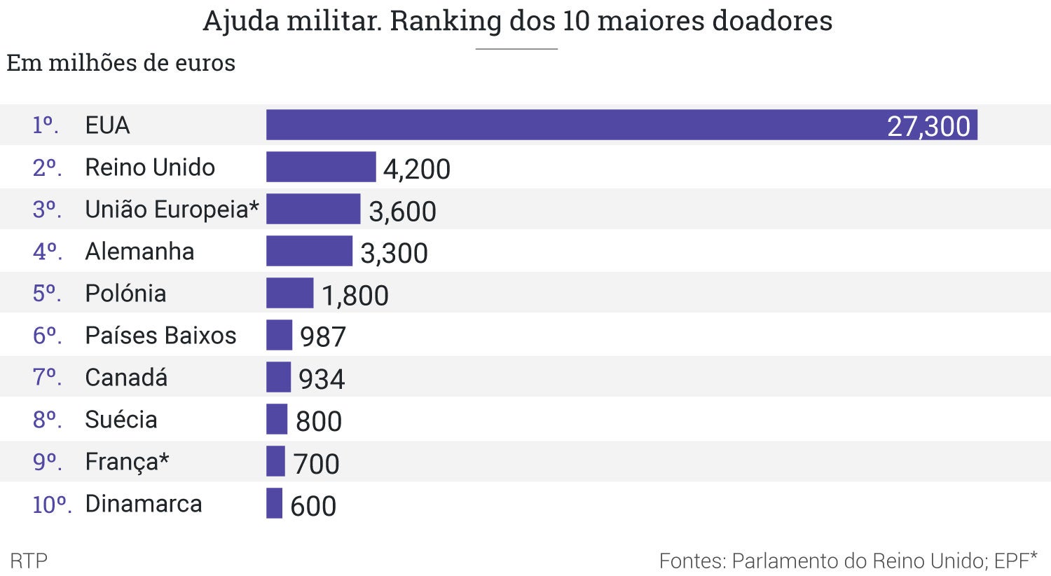 Além dos EUA, com 27.3 MME e do Reino Unido, com 42.2 MME, o maior financiador militar da Ucrânia é a União Europeia enquanto instituição, com 3.6 MME.