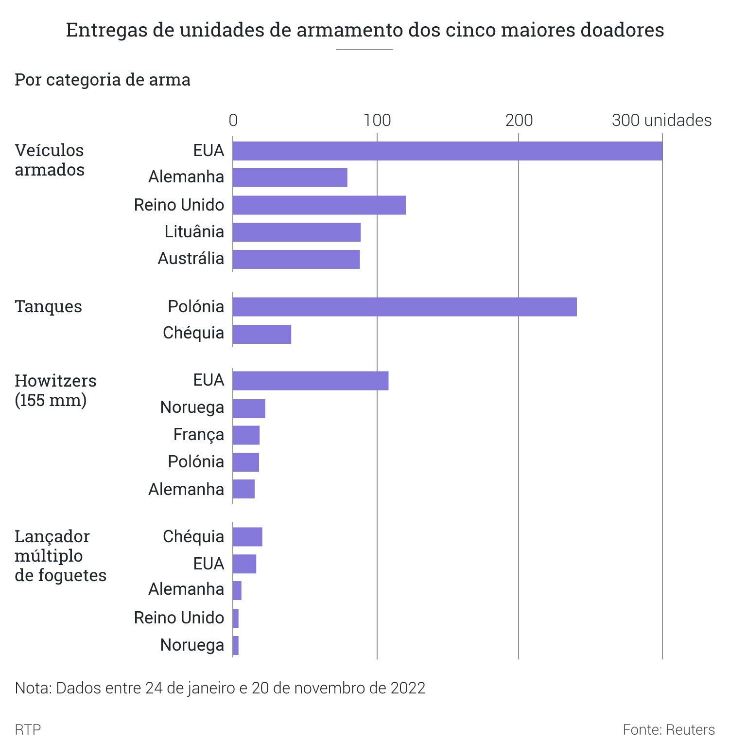 A lista de fornecedores bilaterais de armas à Ucrânia desde fevereiro de 2022 é longa e liderada de longe pelos Estados Unidos da América, que já prometeram 30 mil milhões de dólares (mais de 27 mil milhões de euros) em material e ajudas financeiras desde o início da Administração Biden, a quase totalidade dos quais, 29.3 mil milhões de dólares (27.3 mil milhões de euros), nos últimos 12 meses.