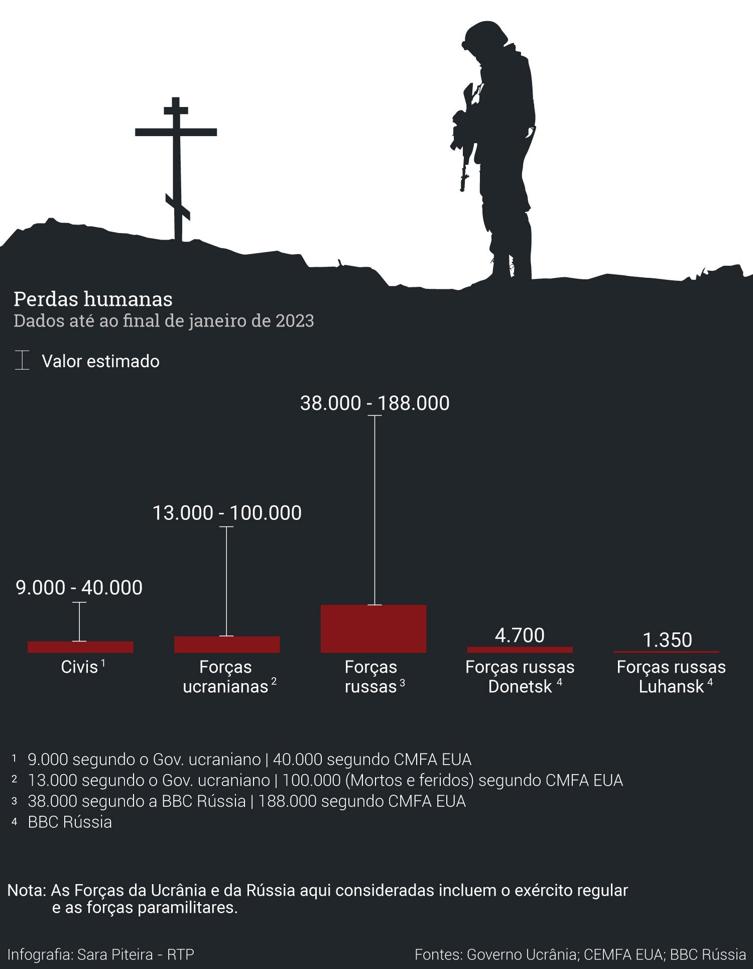 Só com base nas baixas identificadas, em setembro de 2022 teriam já perecido 6.476 soldados russos, de acordo com a BBC Rússia. Um número extremamente conservador, 40 a 60 por cento abaixo do real, de acordo com diversos observadores, e sem contar com os desaparecidos em combate e com os corpos deixados em solo ucraniano.