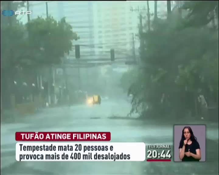 Um tufão, com ventos de 150 quilómetros por hora, atingiu várias ilhas nas Filipinas. Vinte pessoas morreram. Mais de 420 mil tiveram de abandonar as casas e foram para abrigos de emergência. Árvores, postos de eletricidade e telhados são arrancados pela força do vento.