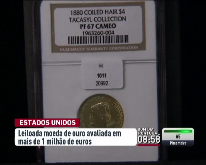 Vai a leilão no estado norte-americano da Califórnia uma moeda que os peritos estimam valer 1 milhão e 100 mil euros. A moeda é de ouro e data de 1880, mas nunca esteve em circulação. Pertence a um lote de apenas 27 moedas de ouro que vão ser leiloadas no dia 23. Têm potencialmente um valor total de cinco milhões de euros. Contas feitas, São 300 mil euros por cada moeda.