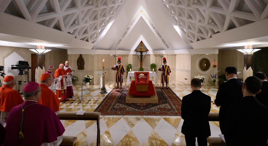 A Santa Sé divulgou na manhã desta terça-feira as primeiras imagens do papa Francisco em caixão aberto. O corpo do sumo pontífice surge acompanhado por dois guardas suíços na capela da Residência Santa Marta.