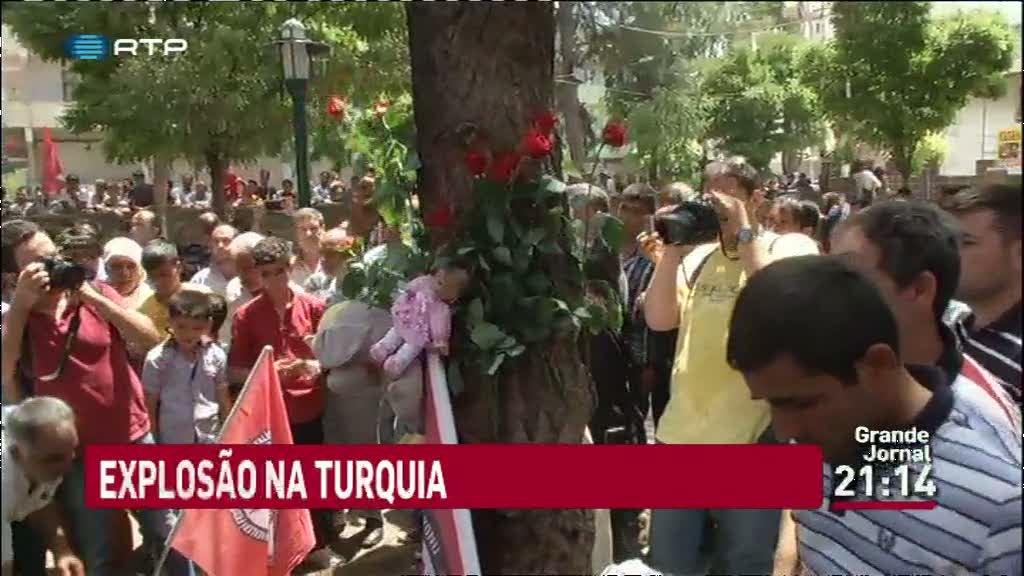 Um vídeo amador registou o momento da explosão que ocorreu na segunda-feira, num centro cultural da Turquia que fica próximo da fronteira com a Síria. Esta terça-feira realizaram-se as cerimónias fúnebres de 27 dos 32 jovens que morreram no atentado.