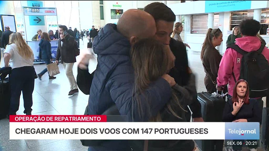 - Chegou esta manhã a Lisboa o primeiro grupo de portugueses abrangidos pela operação de repatriamento, a bordo de um C130 da Força Aérea. Foi ainda mobilizado um avião fretado à TAP, com chegada prevista para as 11h00. Em comunicado, o Governo detalha que, no voo fretado, seguem 147 passageiros retirados de vários países do Golfo Pérsico - 139 são portugueses e oito são de Alemanha, Itália, Reino Unido, Estados Unidos e Peru - e no avião militar viajaram 39 pessoas vindas de Israel - 24 de nacionalidade portuguesa e 15 de França, Grécia, Brasil e Israel. O secretário de Estado das Comunidades esteve presente para receber os cidadãos repatriados;