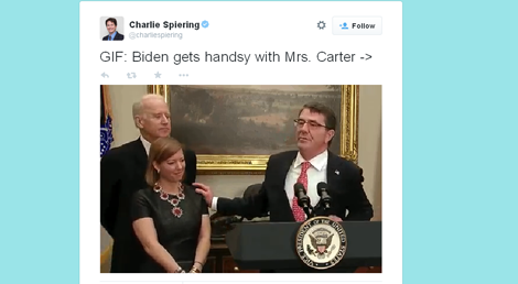 A rede social Twitter explodiu esta terça-feira em censura e comentários a duas novas gaffes do vice-presidente dos EUA. Fotos e um vine de Biden com as mãos nos ombros da mulher do novo secretário da Defesa dos EUA e a sussurrar-lhe ao ouvido, tornaram-se rapidamente virais e motivo de debate nas televisões. Horas depois, numa conferência sobre extremismo violento, o vice-presidente revelou que tem "bons amigos" entre os motoristas de táxi somalis.