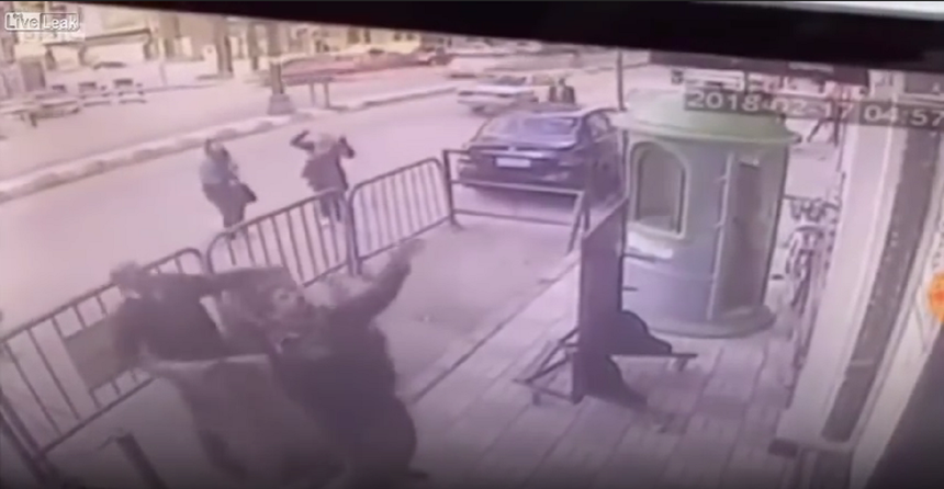 À porta de um banco, em Asyut, no Egito, três polícias repararam numa criança que estava pendurada no terceiro andar do edifício. De imediato aperceberam-se que a criança iria cair e tentaram arranjar forma de a socorrer.