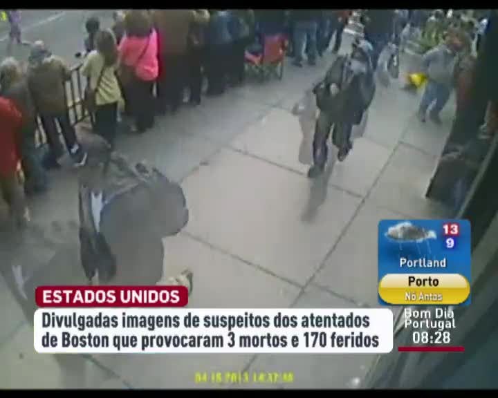 O FBI divulgou vídeos com imagens de suspeitos de explosões de Boston. São dois homens que transportam mochilas e que as autoridades julgam ter atuado em conjunto. Na segunda-feira a explosão de duas bombas durante a Maratona de Boston fez três mortos e cerca de 170 feridos.
