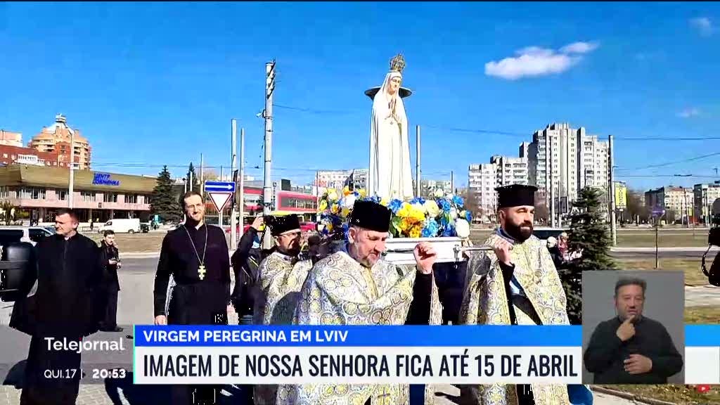 A imagem da virgem peregrina de Fátima foi acolhida por centenas de pessoas na igreja da Natividade, em Lviv. A imagem partiu da Cova da Iria, em Fátima, há 3 dias como "mensageira de paz" e vai ficar na cidade ucraniana até 15 de abril.