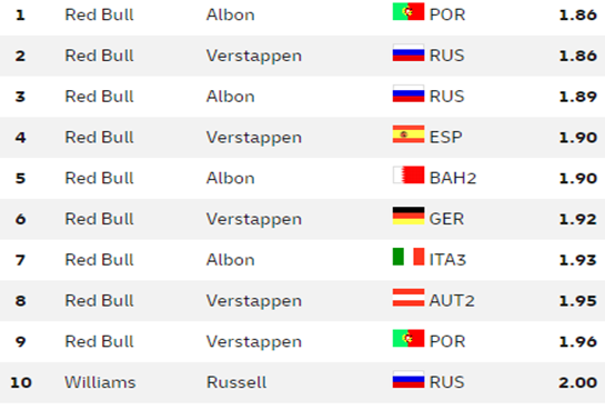 - Mercedes 13, Red Bull 2, Alpha Tauri 1, Racing