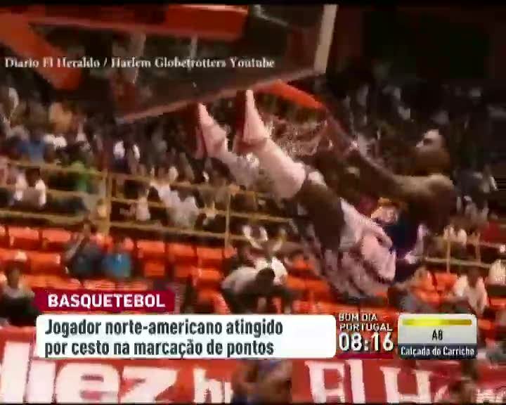 No basquetebol chegam imagens de um valente susto, na Honduras. Foi num jogo de exibição da famosa equipa dos Harlem Globetrotters. Um jogador finaliza a jogada e agarrou-se ao aro e acabou por levar com o cesto em cima. O basquetebolista norte americano acabou por sofrer apenas um pequeno ferimento na zona do sobrolho.