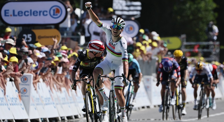 Depois de Mathieu van der Poel (Alpecin-Deceuninck) ter cedido a menos de dois quilómetros do topo do Muro da Bretanha, onde ganhou no Tour2021, ‘Pogi’ acelerou para a vitória na etapa, à frente de Jonas Vingegaard (Visma-Lease a Bike) – os dois acabaram com as mesmas 04:05.39 horas – e do britânico Oscar Onley (Picnic PostNL), terceiro a dois segundos, recuperando também a amarela.